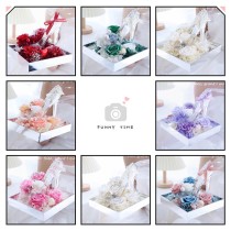 The visible floral structure is also more distinctive than a single-rose keepsake. Multiple preserved roses are arranged around and partly inside the shoe, so the display reads as a fuller floral object rather than just one flower in a novelty container. The available variants are Red, Pink, White, Blue Gray, Purple, Dark Green, Champagne, and White/Black Style.