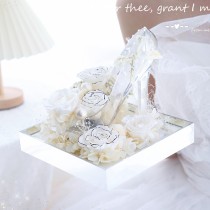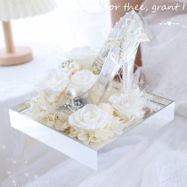 This product makes its structure clear immediately: a transparent acrylic high-heel shoe presented inside a square mirrored tray and filled with a preserved rose arrangement. The shoe shape gives it a stronger visual identity than an ordinary flower box, while the mirrored base and bow detail help the display feel more like a complete decorative gift piece.